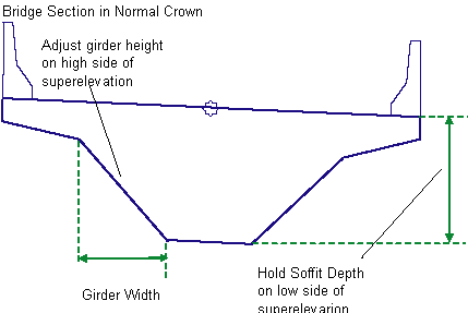 The subassembly builds the links for the bridge deck and under-structure based on the input parameter values given. In superelevation, not all of the structure is rotated. The Soffit Depth is held to the given value from the top-edge-of-deck on the low side of the bridge, and the height of the girder is adjusted on the high side to the root of the deck.