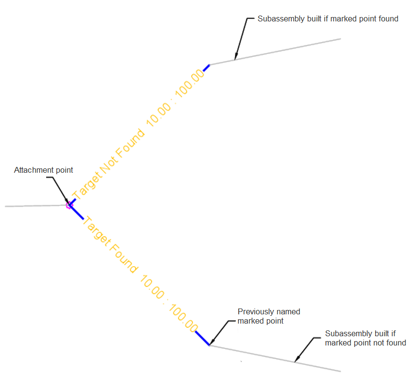 | Condition | Specifies the condition available for this subassembly. The Found condition is processed if the marked point name is found within the maximum distance. The Not Found condition is processed if a marked point name is not set or is not found at the station within the maximum distance. | Found / Not Found | Found |