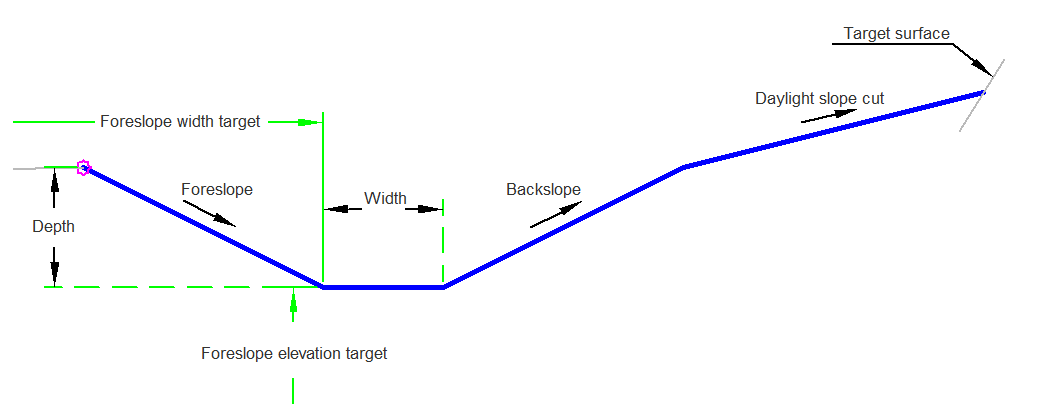 | Foreslope Width | May be used to override the foreslope width. The following object types can be used as targets for specifying this: alignments, polylines, feature lines, or survey figures. | Optional |
