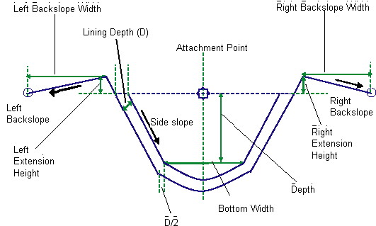 | Lining Depth | Depth of channel lining. The Lining Depth is measured perpendicular to the side of the slope, as shown in the previous diagram. | Numeric, Positive |