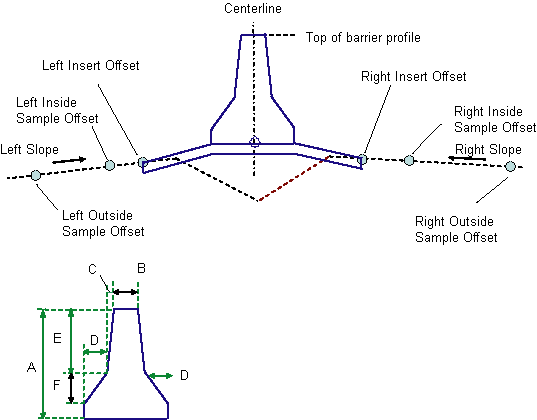 May be used to tie the top of barrier to the elevation of a profile. Dimension E may vary to achieve the calculated barrier heigh. The following object types can be used as targets for specifying this elevation: profiles, 3D polylines, feature lines, or survey figures. |