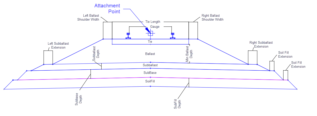 | Subballast Extension (Left and Right) | The distance from the toe of the ballast material to the beginning of the side slope of the subballast material | Numeric, non-negative | 12"