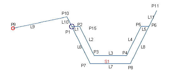 The attachment point is the innermost point on the grading links preceding the ditch structure. If grading links are omitted, then the attachment point is the innermost point on the inside wall of the ditch structure (shown in blue circle).