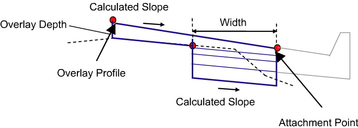 The following illustration shows a situation with an overlay offset profile. (If the Overlay Profile is given, then the slope is calculated between the profile elevation at the inside edge of the overlay and the attachment point.)
