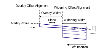 The attachment point determines the offset and elevation of the outside edge of widening. The location of the inside edge of widening and inside edge of overlay are determined using the given widths and slope. Alignments can be used to override the given numeric widths. If the Overlay Profile is given, then the slope is calculated between the profile elevation at the inside edge of the overlay and the attachment point.