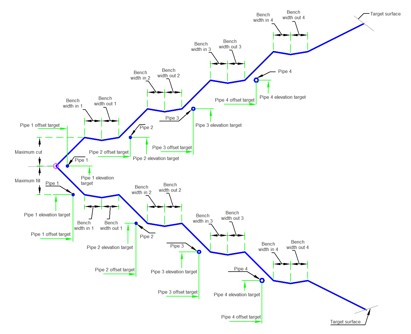 At each bench a pipe is inserted at a distance specified in the input parameters or overridden using targets for offset and elevation. A pipe size of 0 omits the pipe.