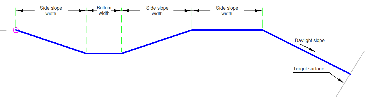 The subassembly builds the shape for a ditch using the input parameters. Once the ditch shape is built the ditch is determined to be in cut or fill. If in cut, a daylight link is added using the daylight slope. If in fill, a berm is created using the side slope width.