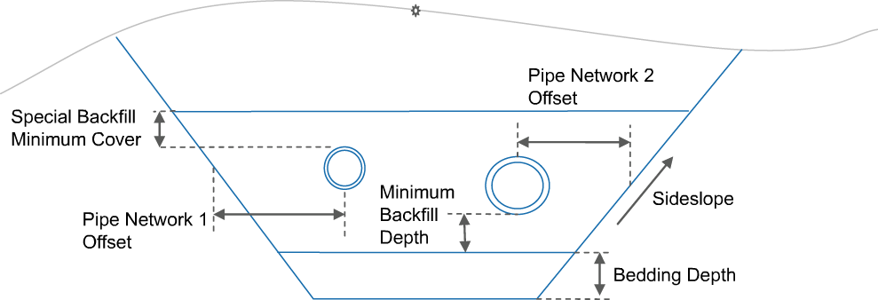 When two pipe networks are selected, Pipe Network 1 will be assumed to be on the left side of the baseline. Pipe network 2 will be assumed to be on the right side of the alignment. The material depth of the Special Backfill Minimum Depth is determined by the higher of the two pipe outer diameters, plus the Special Backfill Minimum Cover depth. The bottom of the trench depth is determined by the lower of the two pipe outer diameters, plus the Special Backfill Minimum Depth, plus the Bedding Depth.