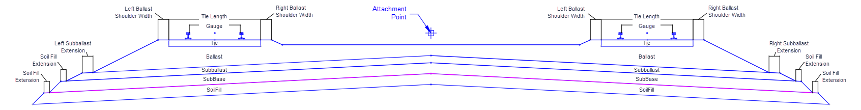In layout mode the subassembly displays the links comprising the rails, tie, ballast, subballast, and side slopes.