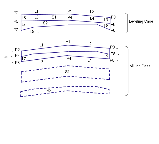 Verticals from existing surface to bottom-of-overlay: Level - For the Leveling case. Mill - For the Milling case. |
