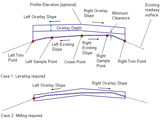 The slope of the Existing Surface on each side is determined betweenthe crown and sample points. The slopes of the overlay layers aredetermined by the following steps: