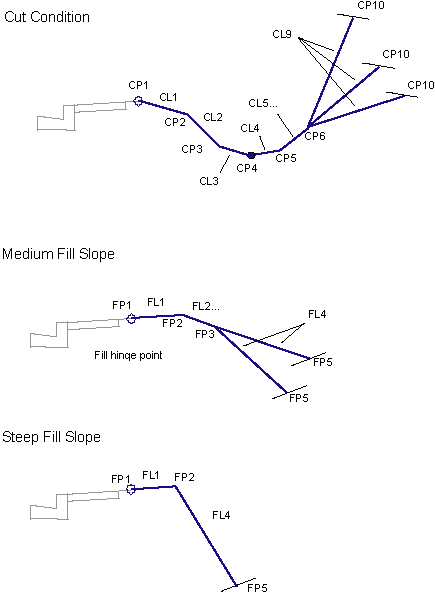 It provides a variety of solutions for cut and fill conditions, as described below. Based on the input parameters provided, it first attempts to build a cut section. If unable to do this it builds a fill section instead. The final daylighting link can be omitted for cases where the corridor model needs to be left in an incomplete state. For example, this might be done so that grading surfaces on adjacent properties can tie to the hinge point on the uncompleted roadway.