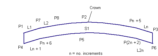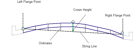 Then a string line is defined by joining the left and right flange points (which are newly established edges of travelways). This string line is divided by "number of increments" parameter and middle one is taken as "crown point" offset. Crown point elevation is established by adding the 'crown height" parameter to the elevation of midpoint on the string line.