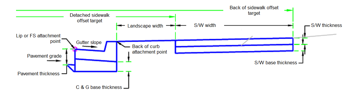 | Detached Sidewalk Offset | May be used to override the fixed sidewalk width and tie the inside edge of sidewalk to an offset alignment. The following object types can be used as targets for specifying the width: alignments, polylines, feature lines, or survey figures. | Optional |