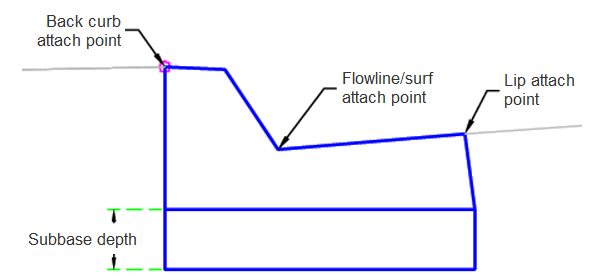 The subassembly builds the shape for the selected curb, curb and gutter, or surface curb, with the attachment point either at (a) inside edge of the gutter (or lip), or (b) the back of the curb or (c) the flowline (or surface) of the curb or gutter.