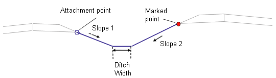 The locations of the attachment point and marked point are determined. The marked point may be either to the right or left of the attachment point. Links are extended inward at Slope 1 from the attachment point, and at Slope 2 from the marked point, until they intersect. If a ditch width is given, a horizontal bottom-of-ditch link is fit into the intersecting side slopes.
