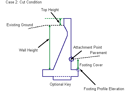 In a fill condition, the sloping wall face is toward the center of the roadway. In a cut condition, the sloping wall face is away from the roadway, toward the earth being retained. If the Key option is set to No, then the base of the footing is a single horizontal link. If the Key option is used, links to define the optional key are created.