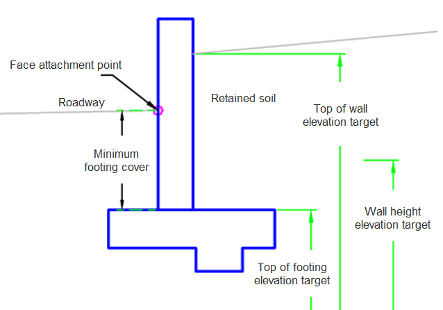 If the Elev at Face target is set the elevation is used. If the Elev at Face is not set then the Top of Footing plus the minimum footing cover is used. The top of footing target elevation is used to determine the physical height of the retaining wall. The footing builds using the standard plan dimensions based on the Wall Height Target.