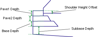 The Pave1, Pave2, and Base surface links are inserted parallel to the finish grade at the given depths. If the layer Extension values are non-zero, each layer is extended for the given distance beyond the shoulder hinge point. Each layer should be as wide as or wider than the one above it.