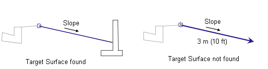 In layout mode, this subassembly attempts to find the intersection of the link, if the target surface was inserted by a previous subassembly. If an intersection is found, the link is displayed at the given slope to the surface. If not, the link is displayed at the given slope outward for a slope distance of 3 meters or 10 feet, terminating in an arrowhead pointing outward.
