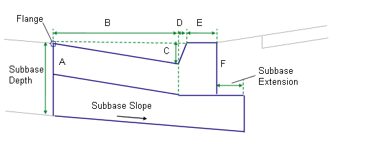 The curb and gutter links are inserted based on the Input Parameter values for Dimension A – Dimension F. All dimensions must be positive, non-zero values. If a non-zero subbase depth is given, the subbase layer is inserted to the back of curb, and continues for the Subbase Extension width. The subbase layer closes to the bottom-back-of-curb, as shown in the diagram.