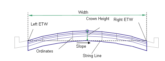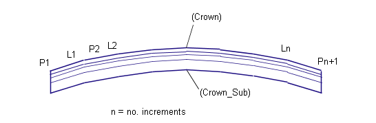 The center of the string line is calculated by subtracting the Crown Height from the attachment point, and the left and right edges-of-traveled-way are calculated by applying the Width and Slope symmetrically about the attachment point. The ordinates of the parabolic curve are calculated at even intervals along the string line, and straight line links are added to connect the ordinate points. Parallel surfaces are inserted for the Pave1, Pave2, Base, and Subbase surfaces from the given depths.