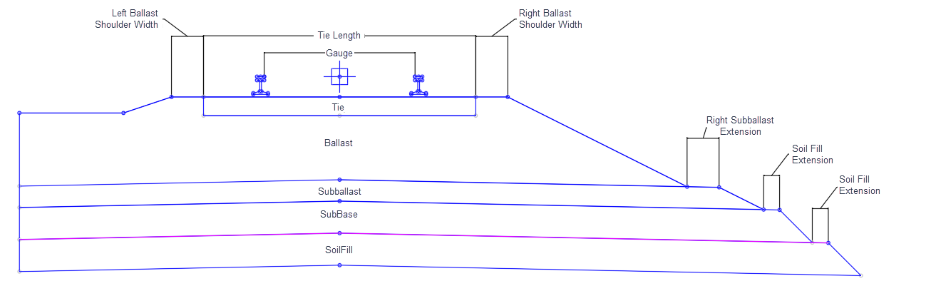 In layout mode the subassembly displays the links comprising the rails, tie, ballast, subballast, and side slopes.