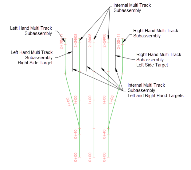 The Right_Hand_Multi_Track subassembly is used for a single railroad that includes sleepers, ballast, subballast, and two additional layers or materials which can be used for Sub Base and Soil Fill material.