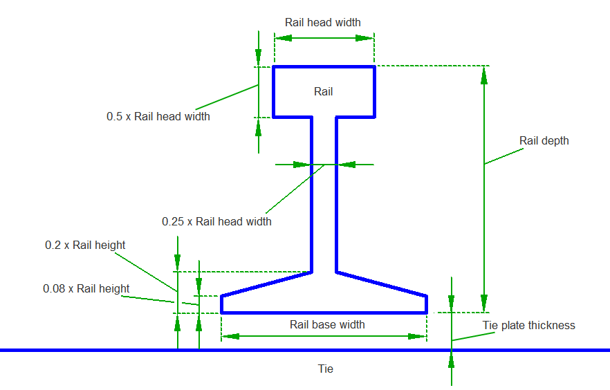 The rail shape used in this subassembly is a simplified approximation of industry standard rail shapes and dimensions. Rail Head Width, Rail Depth, and Rail Base Width are available as input parameters and are used to derive the remaining approximated dimensions.