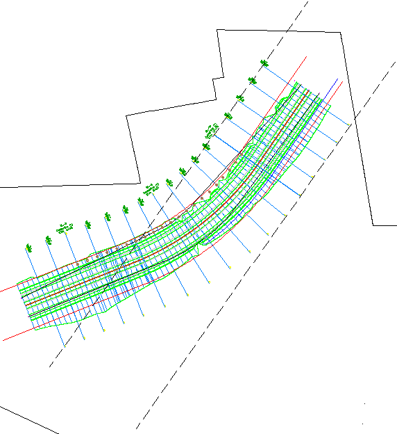 At sample lines SL-07, SL-08, SL-12, and SL-13, examine the proximity of the utility pole blocks. You specified a distance of 50 feet as the projection distance, which means that specified objects that are within 50 feet of a sample line will be projected.