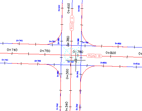This drawing contains an intersection of a primary road (Road A) and a secondary road (Road B). There currently are no corridors or corridor assemblies in the drawing.