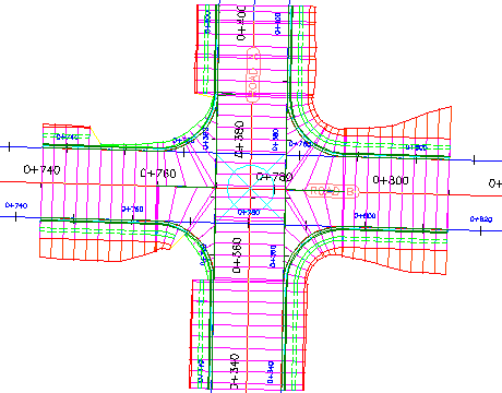 The corridor is recreated. Notice that the modifications that you made to the Road A baseline, including the assembly frequencies and region start station, returned to their original settings. This happened because the corridor was recreated using the parameters that were originally specified during the intersection creation process. Modifications that are made to the corridor in the intersection area are not retained when you recreate the corridor from the intersection object.