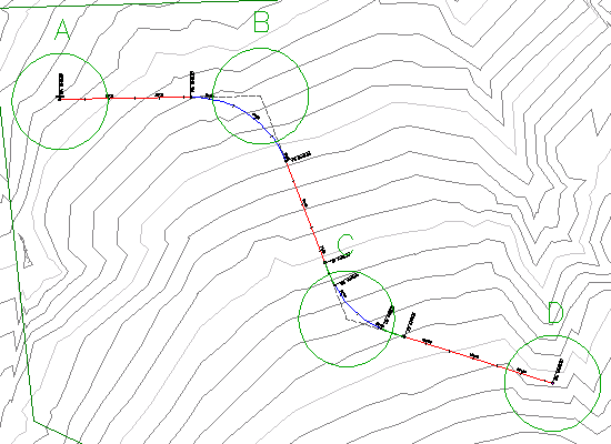 The drawing contains a simple alignment consisting of three tangents. In the next few steps, you will add free curves at circles B and C.