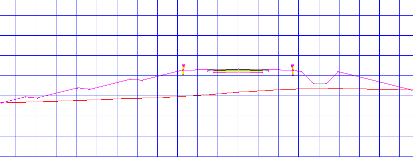Starting at station 2+00, the corridor enters a cut condition. At this station, the cut is less than 5.0000’, so the DaylightOffsetToSurface subassembly is applied after the ditch.