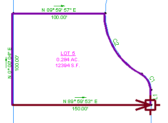The Mapcheck command checks the figure for length, course, perimeter, area, error of closure, and precision. It starts at the beginning of the figure and computes the figure vertex XY coordinates for each segment. These computations are based on the actual labeled values, and not the inverse direction and distance/curve data and the Linear and Angle precision (set in the Survey Database Settings).