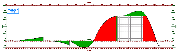 Notice that this is near the point at which the overhaul volume (in red) and the free haul volume (in green) meet the mass haul line. If you examine this station on the profile, you see that it is also a relatively flat section of the existing ground surface. Flat areas can also be good locations for dump sites and borrow pits.