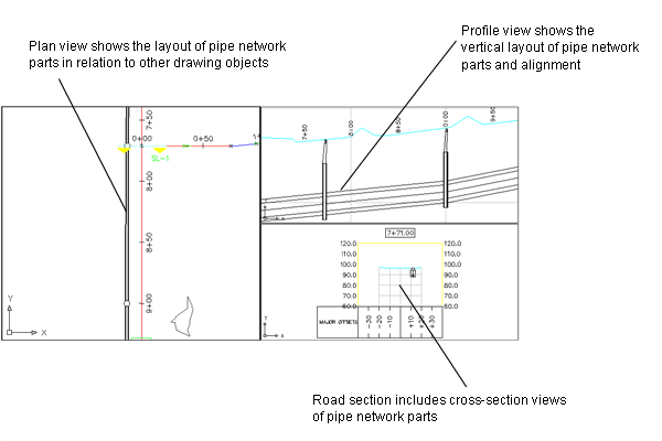 This illustration displays three viewports: the pipe network in plan view, the profile view of some of the network pipes and structures, and the same parts in a section view.