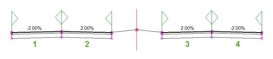 To build an undivided crowned roadway assembly with axis of rotation pivot points, the parameters in the following table must be set as shown for each corresponding LaneSuperelevationAOR subassembly. The other lane subassembly parameters do not affect the axis of rotation pivot points.