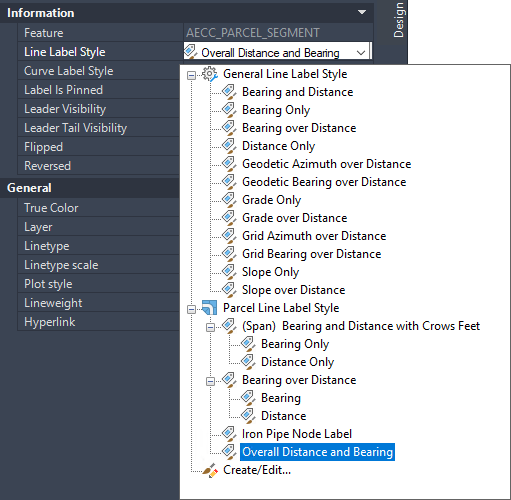 Notice in the following example that in addition to the Parcel Line Label Styles, the General Line Label Style is available for use when editing a Parcel Line Label.