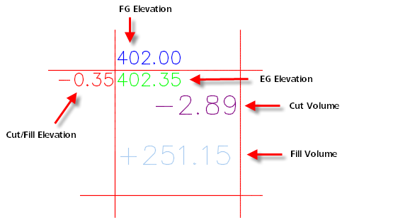 Earthwork Plan Production command to insert labels in a grid and tables that contain information about the volume of the earthwork between two TIN surfaces. The following illustration shows an example of the grid, labels, and tables that are inserted into a drawing when using this command.
