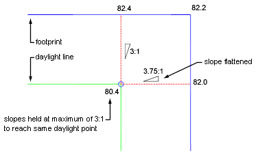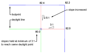 Hold Slope As Maximum: Holds the specified grade or slope as the maximum and flattens out the slope projected from the footprint on one side.
