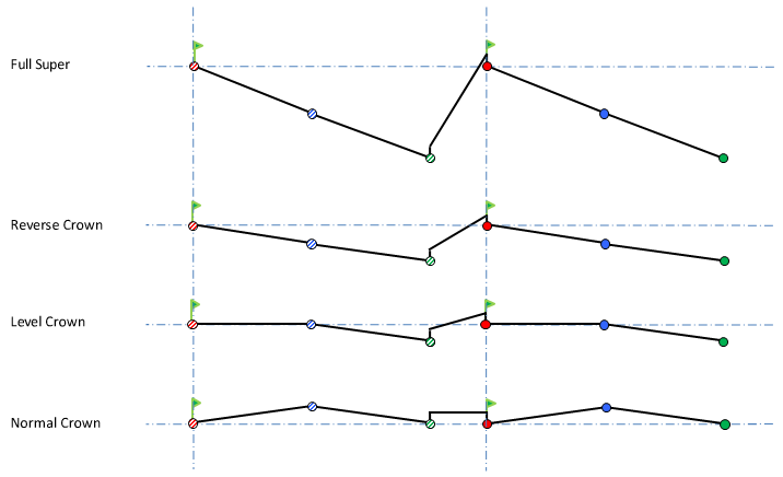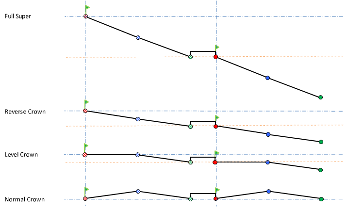 The following illustration shows a divided road as the corridor type and a crowned cross section shape on each side. The roadway undergoes adverse crown removal during superelevation: