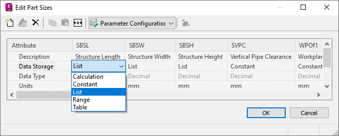 - To add a list of available sizes for the part, change the data storage type of a size parameter to List.