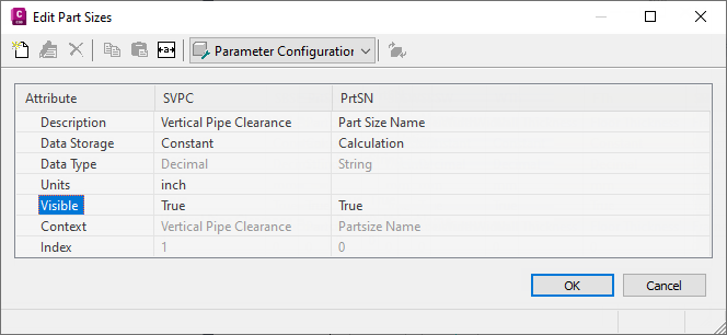 The Edit Part Sizes dialog box is displayed, showing all of the currently available size parameters for the selected part. For the Simple Cylindrical Structure part example, some default size parameters are Part Size Name (PrtSN) and Structure Vertical Pipe Clearance (SVPC).
