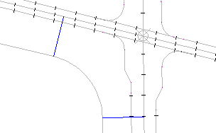 This command can help you design for a minimum distance between an alignment centerline and the right-of-way, for example. The blue lines in the following illustration show the minimum distance found.