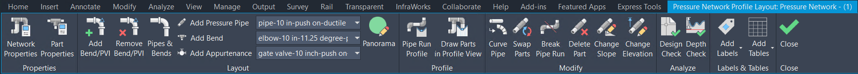 Pressure Network Profile Layout ribbon to work with pressure networks in profile view.
