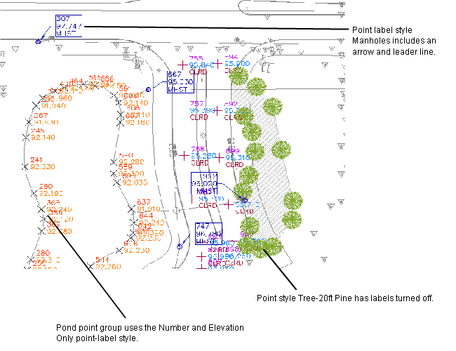 Points are numbered and named uniquely. Each point has properties that can include information such as northing, easting, elevation, and description. A point that is displayed in a drawing can have additional properties that control its appearance, such as a point style, a point label style, and a layer.