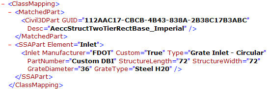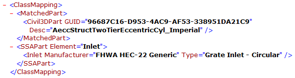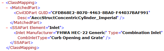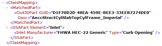 <ClassMapping> <MatchedPart> <Civil3DPart GUID = "260FBCAD-7BFC-4DC4-AD9C-84D552C799F5" Desc = "InltCurb1"/> </MatchedPart> <SSAPart Element = "Inlet"> <Inlet Manufacturer = "FDOT" PartNumber = "Curb Inlet - Type 1"/> </SSAPart> </ClassMapping>