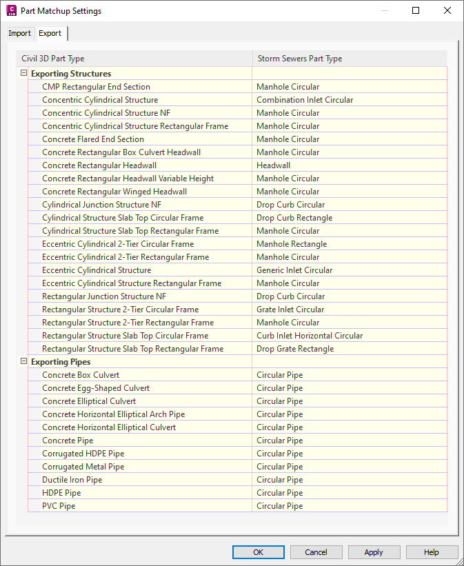 The Export tab as shown below enables you to select any of the available Storm Sewers Part Types (on the right) to match to each of the Autodesk Civil 3D Part Types found in the current Part Catalog. The Autodesk Civil 3D Part Types that are shown are updated based on changes made to the Part Catalog.