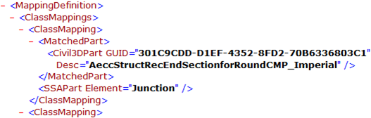 <ClassMapping> <MatchedPart> <Civil3DPart GUID="30921980-2D9B-493A-88C5-6D10AEA8B835" Desc="AeccCircularConcretePipe_Imperial"/> </MatchedPart> <SSAPart Element="ConveyanceLink"> <ConveyanceLink Type="Pipe"> <Pipe Shape="Circular"/> </SSAPart> </ClassMapping>